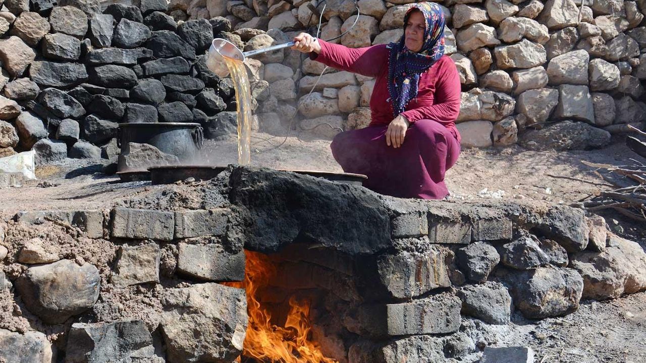 büyük kazanlarda saatlerce odun ateşinde kaynatılarak pekmez haline