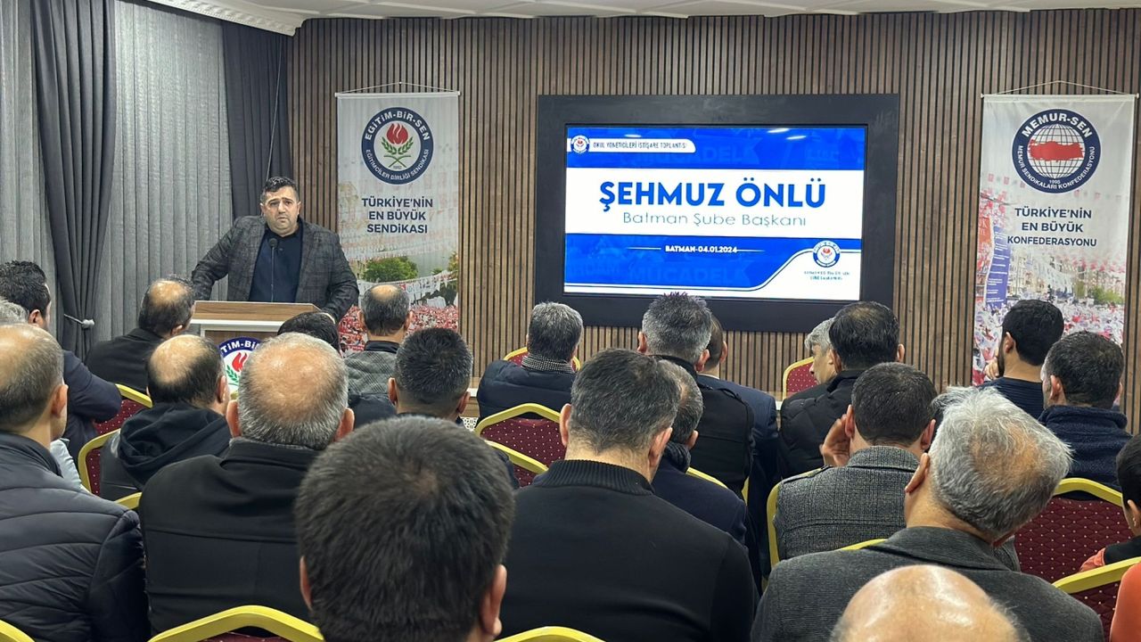 Batman’daki eğitim kalitesinin artırılması ve öğretmenlerin yaşadığı sorunların çözüme kavuşturulması için sonuna kadar mücadele edeceklerini ifade eden Önlü, “Bu süreçte sözleşmeliden kadroya geçirilen ama aile birliğini sağlayamayan öğretmenlerin sesi olmaya devam edeceklerini ifade etti. Norm kadro fazlası öğretmenlerin resen atamasında karşılaşılan sorunların çözümü için gerekli görüşmelerin yapıldığını bu konuda öğretmenlere gereken desteğin verileceğini söyleyerek bir öğretmenin sorunu tüm sendikamızın sorunudur dedi. Batman Şubesi olarak bugüne kadar öğretmenlerimizin mesleki gelişimlerine katkıda bulunduklarını sendika binasının adete bir eğitim yuvası gibi çatıştığını, öğretmenlerimizin mesleki gelişimini sağlamak için yüz yüze ve online eğitimlerin verildiğini ifade ederek; yüksek katılımdan dolayı öğretmenlerimize şükranlarımızı sunuyoruz.” dedi.