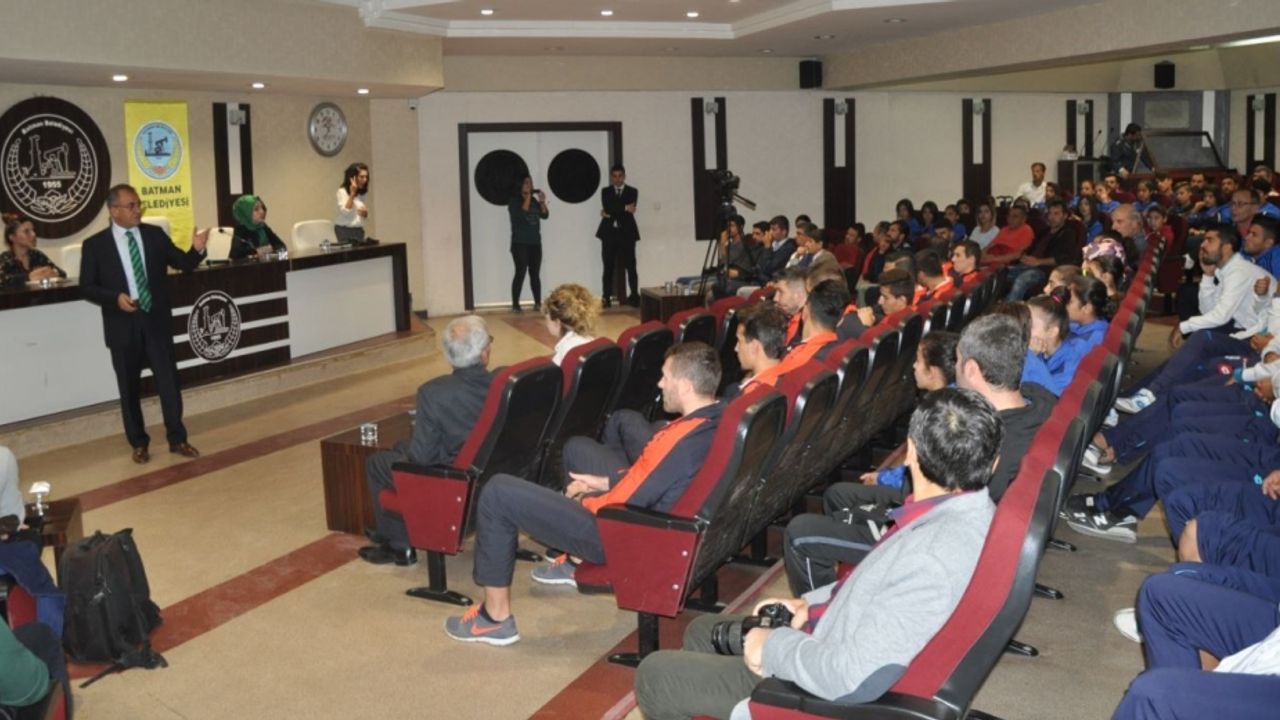 Belediye yönetimi olarak temel hedeflerinden birinin de iyi birey ve iyi nesil yetiştirmek olduğuna dikkat çeken Belediye Başkan Yardımcısı Doç. Dr. H. Murat ŞAHİN, belediyenin sportif hizmetleri ve projeleriyle ilgili şu bilgileri verdi; 'Yaklaşık bir yıldan bu yana Belediye Başkan Vekilimiz Ertuğ Şevket AKSOY ve çalışma arkadaşlarımız ile Batman İçin, gençlerimiz ve çocuklarımız için güzel çalışmalar yapma gayreti içerisindeyiz. Temel hedeflerimiz sporda gençlerimize, çocuklarımıza kaliteli hizmet ve eğitim vermek. 50 dekarlık alana kuracağımız Spor Köyü'nde çim saha, basketbol, voleybol sahaları, tenis kortları, atletizm pisti, antrenman sahaları ve kapalı spor salonları yer alacak. Göreve geldiğimizde Sportif faaliyetlerde Belediyenin bünyesinde hiçbir spor branşı bulunmazken Ekim 2017 tarihi itibariyle 18 spor branşı belediyenin bünyesinde faaliyet gösteriyor.'