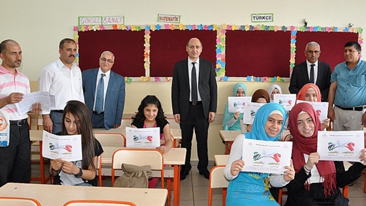 Karne töreninde konuşan Milli Eğitim Müdürü Mahmut Kurtaran, 'İlimizde zorunlu eğitim çağında olan 5 bin dolayında Suriyeli çocuk bulunuyor. Bunlardan 300'ü bizim eğitim kurumlarımızda, 600'ü Mehmet Akif İlkokulu bünyesinde bulunan Suriye Dost ve 300'ü de geçici prefabrik Suriye Can Okulunda eğitim görmektedir. Milli Eğitim olarak hedefimiz önümüzdeki eğitim sezonunda ilimizde bulunan zorunlu eğitim çağındaki tüm Suriyeli çocukları eğitim öğretime katmaktır. Valiliğimizin desteğiyle diğer kurumlarımızla birlikte milli eğitim olarak ilimizde bulunan misafirlerimize en iyi eğitim hizmetini sunmaya çalışıyoruz. 2015-2016 eğitim-öğretim yılı sonunda ilimizde eğitim gören Suriyeli misafir öğrencilerimize karnelerini verdik.' dedi.
