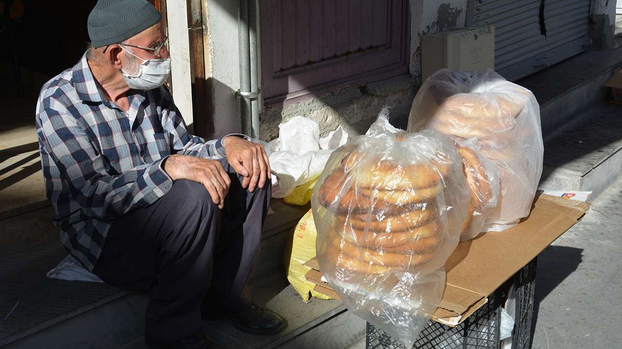 etmesine rağmen hasta ve yaşlı haliyle, bir iş yerinin önünde tandır ekmeği