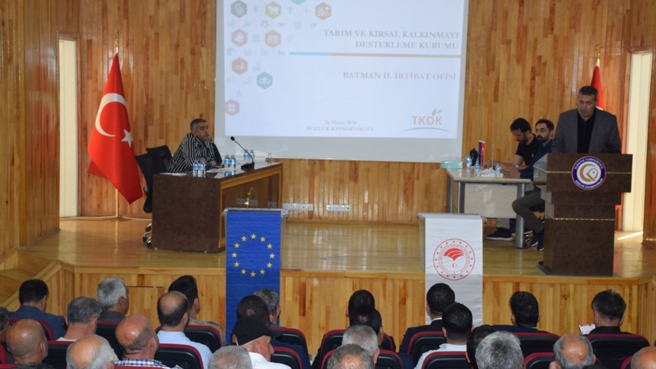 Kozluk Kaymakamlık Konferans Salonu’nda gerçekleşen TKDK (Tarım ve Kırsal Kalkınmayı Destekleme) İPARD Programı tanıtım ve bilgilendirme toplantısına Kozluk Kaymakamı Ekrem Güngör, Belediye Başkanı Mehmet Veysi Işık, Bekirhan Belde Belediye Başkanı Fırat Karabulut, kurum amirleri, köy ve mahalle muhtarları, çiftçiler ve yatırımcılar katıldı.