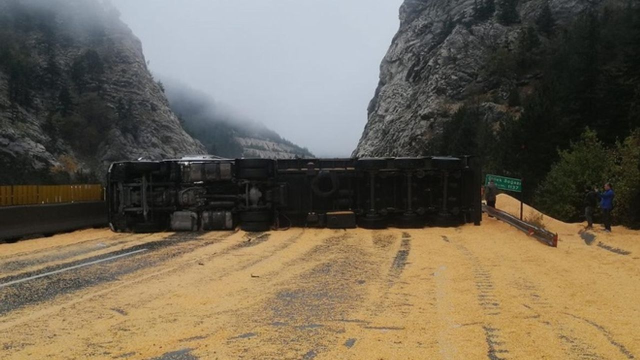 Sürücüsü öğrenilemeyen tahıl yüklü tır, Tarsus-Ankara Otoyolu'nun Gülek Boğazı mevkiinde devrildi.