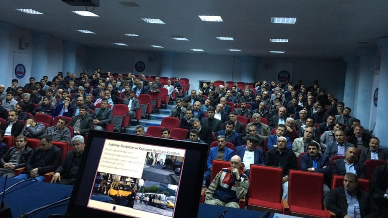376 servis şoförünün katıldığı seminerde anlatılan konularla ilgili doküman dağıtıldı. Mehmet Emin Uraz