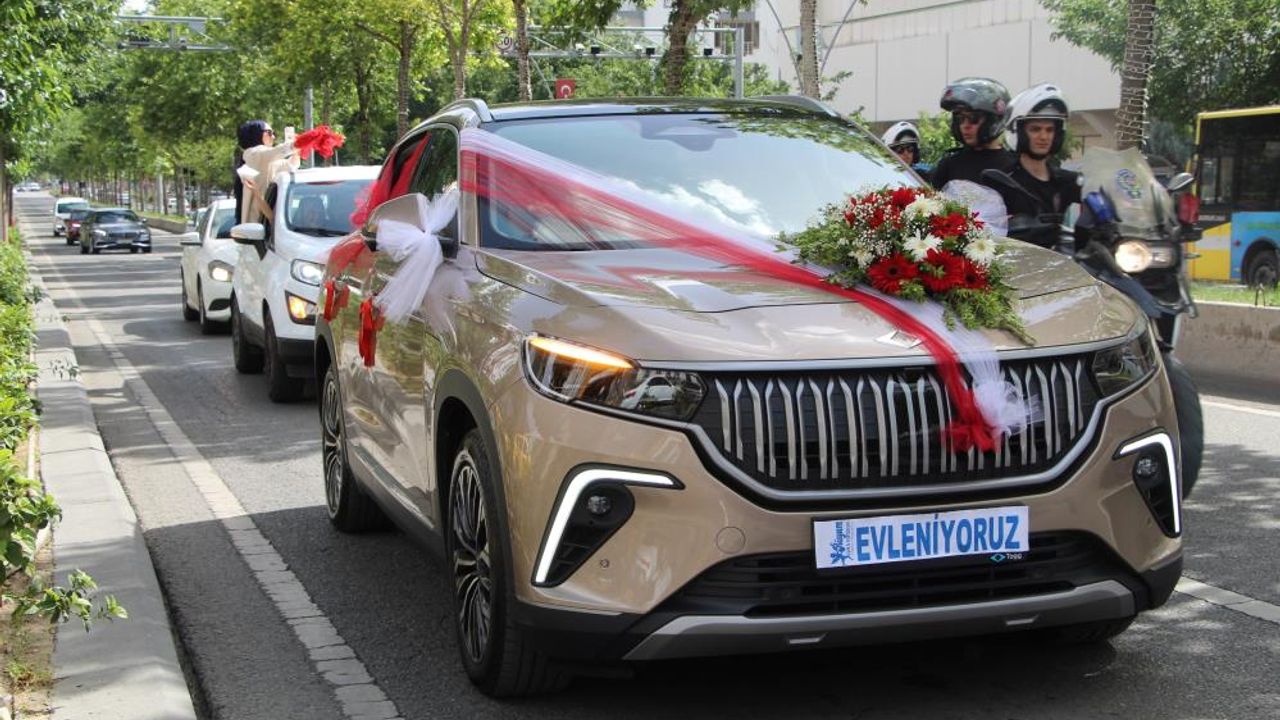 süslenerek dünya evine giren çiftin gelin arabası oldu. Togg'un, Vali Ekrem
