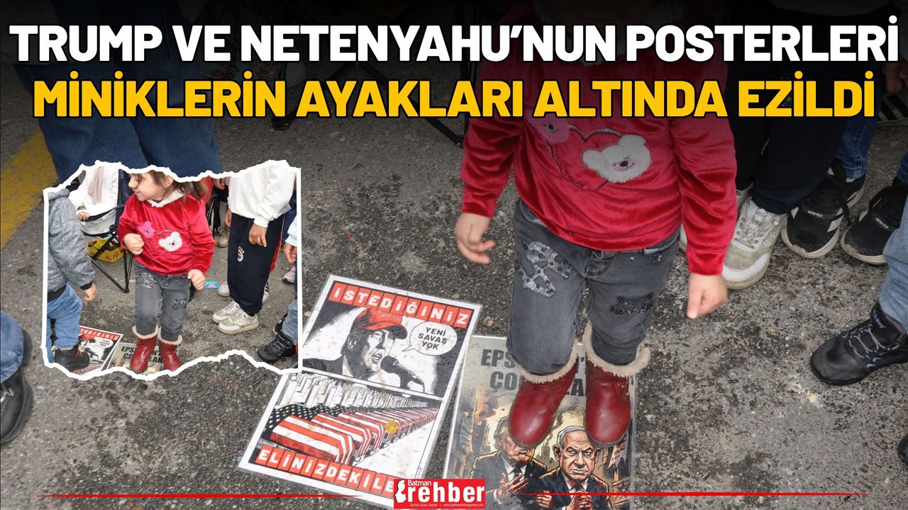 Etkinliğe katılan çocukların, ABD Başkanı Donald Trump ve İsrail Başbakanı Binyamin Netanyahu’ya ait posterleri ayaklarıyla çiğneyerek tepki göstermesi, alandaki duygu yoğunluğunu gözler önüne serdi.