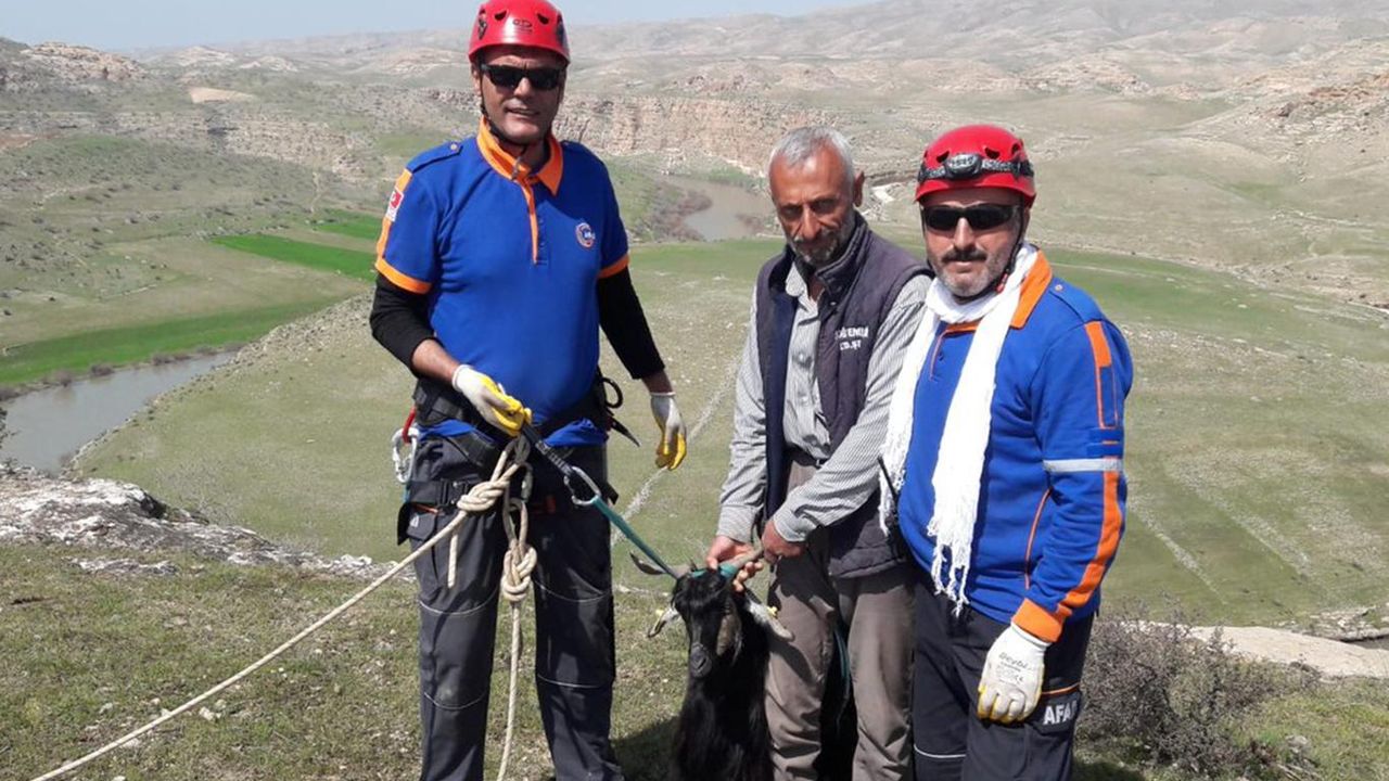 kullanarak keçiye ulaştı. Ekipler, halat desteğiyle uçurumda mahsur kalan