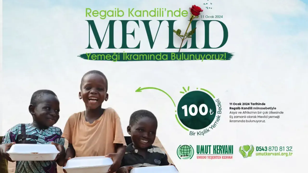 Yapılacak çalışma ile ilgili Umut Kervanı Genel Merkezi'nden yapılan yazılı açıklamada, "Mübarek gün ve gecelerde özellikle mazlum coğrafyalarda yaşayan kardeşlerimize ikramda bulunarak toplu mevlit yemekleri veriyoruz. Bu nedenle üç ayların başlangıcı ve başlangıcına denk gelen ilk perşembeyi cumaya bağlayan gece mübarek Regaip gecesidir bu mübarek gecede başta Gazze olmak üzere birçok mazlum coğrafyada kardeşlerimize, medrese ve yetimhanelerimizde ki öğrencilere yönelik toplu mevlid yemekleri vereceğiz. Bu projemize destek veren tüm hayırseverlerimize şimdiden teşekkür eder, Rabbimizden kendilerine kat kat ecirler vermesini dileriz." denildi.