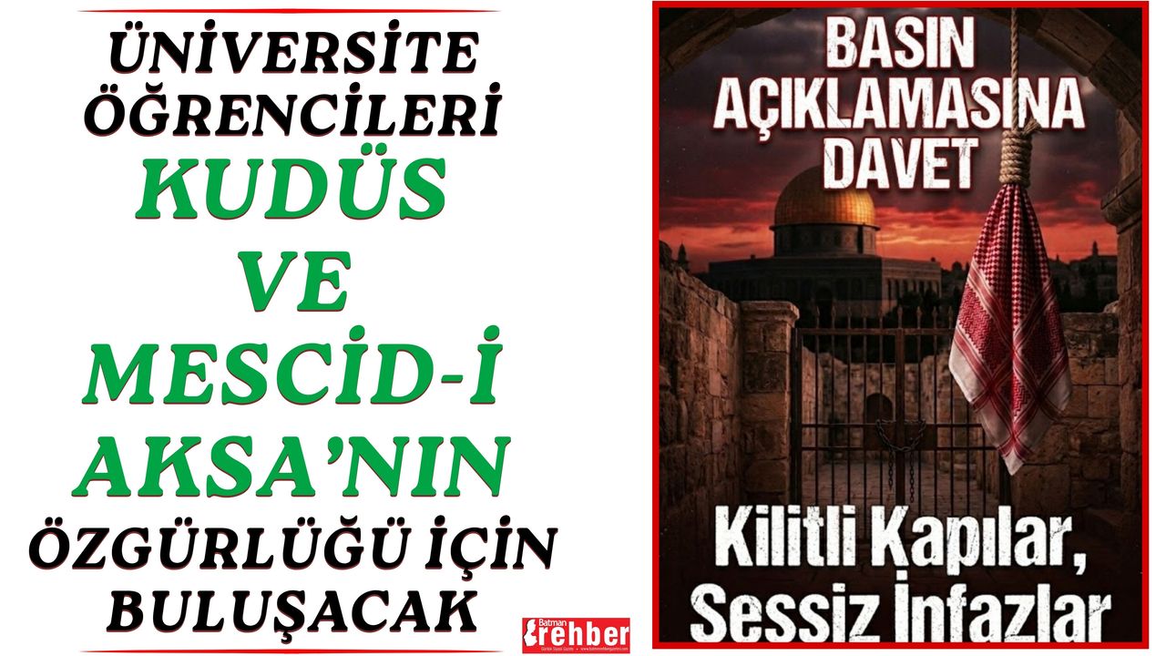 Batman Üniversitesi bünyesindeki öğrenci toplulukları, Filistin’de yaşanan hak ihlalleri ve Mescid-i Aksa üzerindeki kısıtlamalara tepki göstermek amacıyla kitlesel bir basın açıklaması düzenleyecek. Yarın (Cuma) gerçekleştirilecek etkinlikte Filistin halkıyla dayanışma mesajı verilecek.