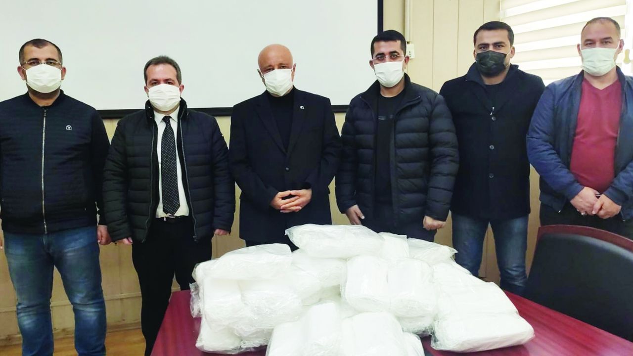Birlik Başkanı Nurullah Tüzün beraberindeki birlik yöneticileriyle birlikte getirdikleri maskeleri Rektör Durmuş’a teslim etti.