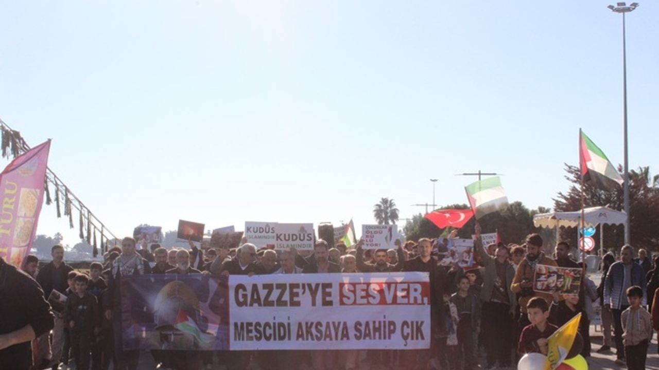Kudüs ve Aksa Tufanı'na destek amacıyla Atatürk Parkından Mersin Limanı'na kadar yapılan yürüyüşte sık sık tekbir getirilerek, "HAMAS'a selam, direnişe devam" sloganları atıldı.