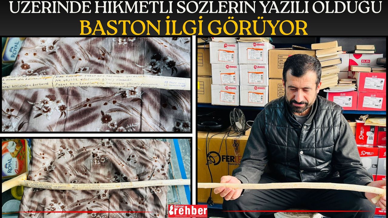 Batman merkezde yaşayan esnaf Abdulhalim Turgut’un dükkânında bulunan özel bir baston, görenlerin dikkatini çekiyor. Üzerinde hikmetli sözler, tefsir ve hadislerden alınmış ibretlik yazılar yer alan baston, müşterilerin ilgisini üzerine topluyor. Dükkâna gelen ziyaretçiler, bastonu ellerine alarak üzerindeki yazıları dikkatle inceliyor.