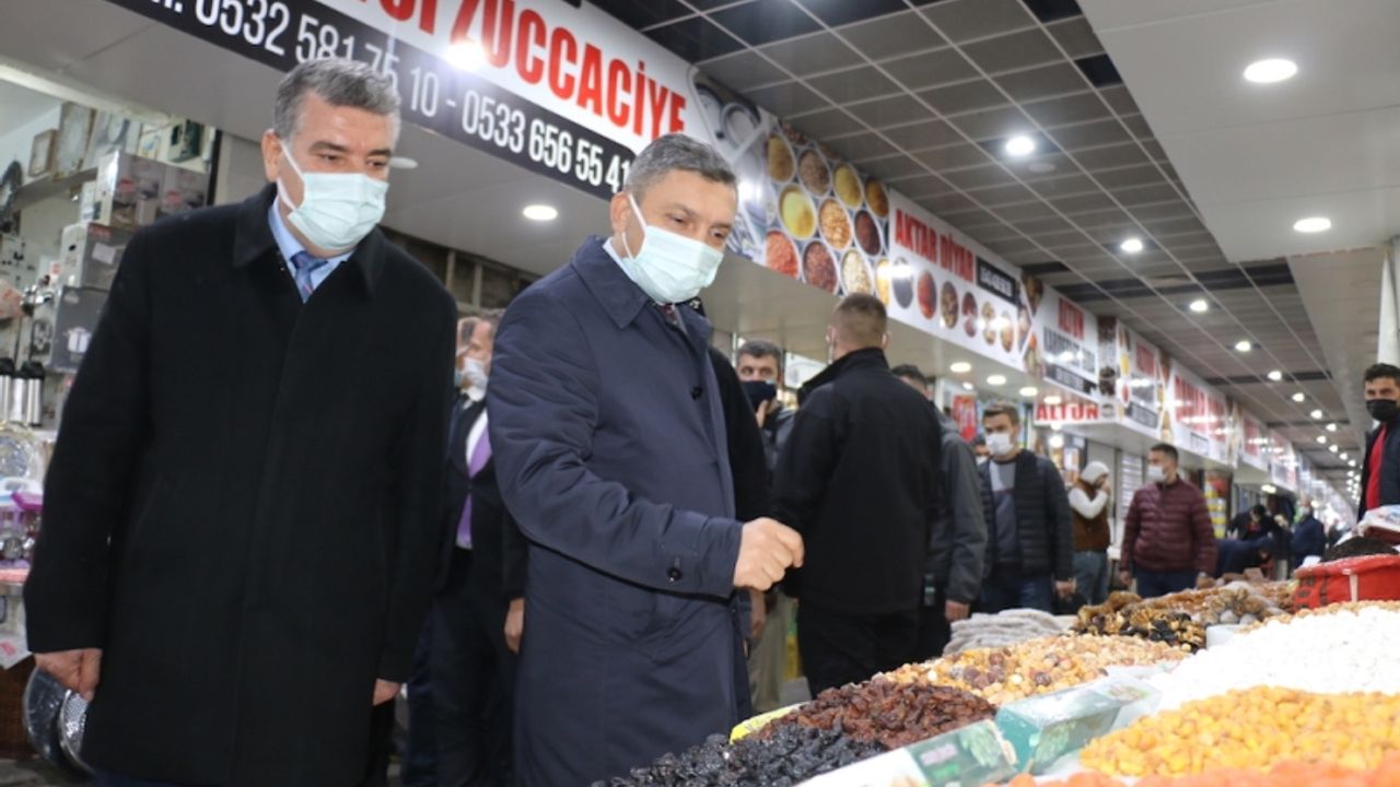 Vali Şahin, başkan yardımcıları ve birim müdürleriyle birlikte Elma Sokağı ve Ulu Cami civarında bulunan esnafları ziyaret ederek tedbirleri elden bırakmamaları ve maske, mesafe, hijyen kurallarına uymalarını istedi.