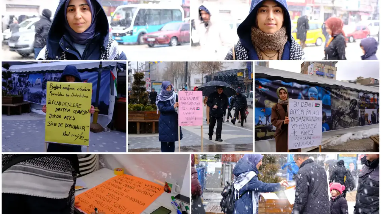 Soğuk havaya rağmen üzerinde "Bu denli büyük bir acı yaşandığında yeryüzünde hiç kimse masum kalamaz", "Tüm uyuyanları uyandırmaya tek bir uyanık yeter", "Çiçeklere su verdim, serçeler için camın önüne ekmek koydum. Amerika ve siyonsitler hakkında kötü şeyler düşündüm, sonra da şunu mırıldandım Allah benden razı olsun…" yazılı pankartlarla sessizce duran kardeşler, kendi hazırladıkları el broşürü, mektup ve Filistin temalı ürünleri dağıtarak 7’den 70’e Filistin bilincini aşılamayı hedefliyor.