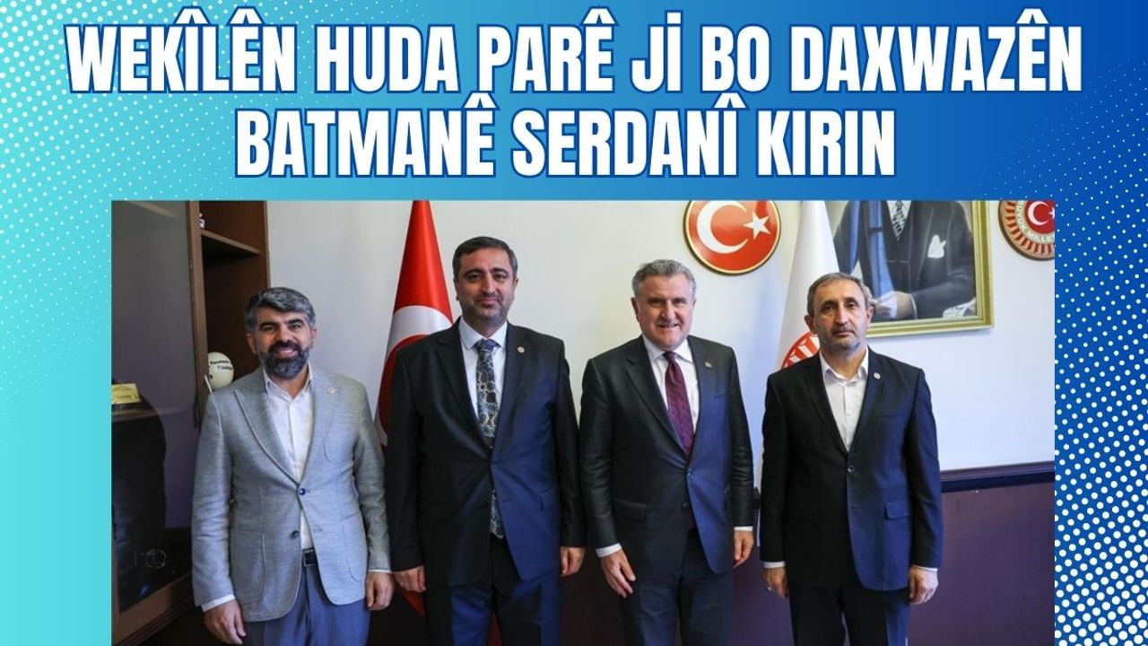 Sê parlementerên HUDA PARê bi Wezîrê Ciwanî û SporêOsman Aşkin Bak re ji bo daxwazên Batmanîyan bi cî bînin hevdîtin pêk anîn.Parlementerên HUDA PARê Serkan Ramanli, Şehzade Demir û Faruk Dinç di derbarêdaxwazên welatiyên Batmanê de bi wezîr re hatin cem hev.