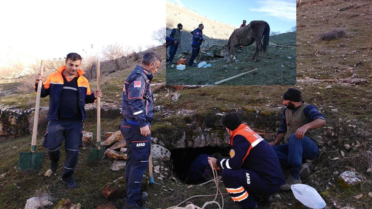 bölgesinde bulunan yılkı atlarından biri düştüğü mağarada mahsur kaldı. Olayın