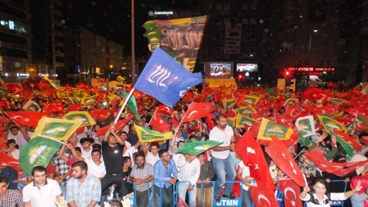 Alanda demokrasi nöbetinde bekleyen binlerce kişi sık sık, 'İşte ordu işte komutan', 'Hainler halka hesap verecek', 'Dik dur eğilme Batman seninle', 'Şehitler ölmez vatan bölünmez', 'Darbeler tutmaz ezanlar susmaz' sloganları attı. Haber Merkezi