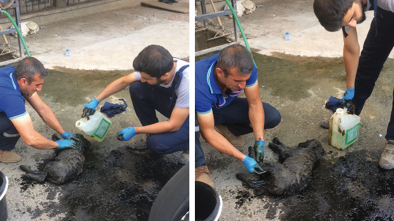 Köpekler, Batman Belediyesi Veteriner İşleri Müdürlüğü Hayvan Bakım Evi'nde zeytinyağı ve sabunla yıkanarak petrolden tümüyle temizlendi.