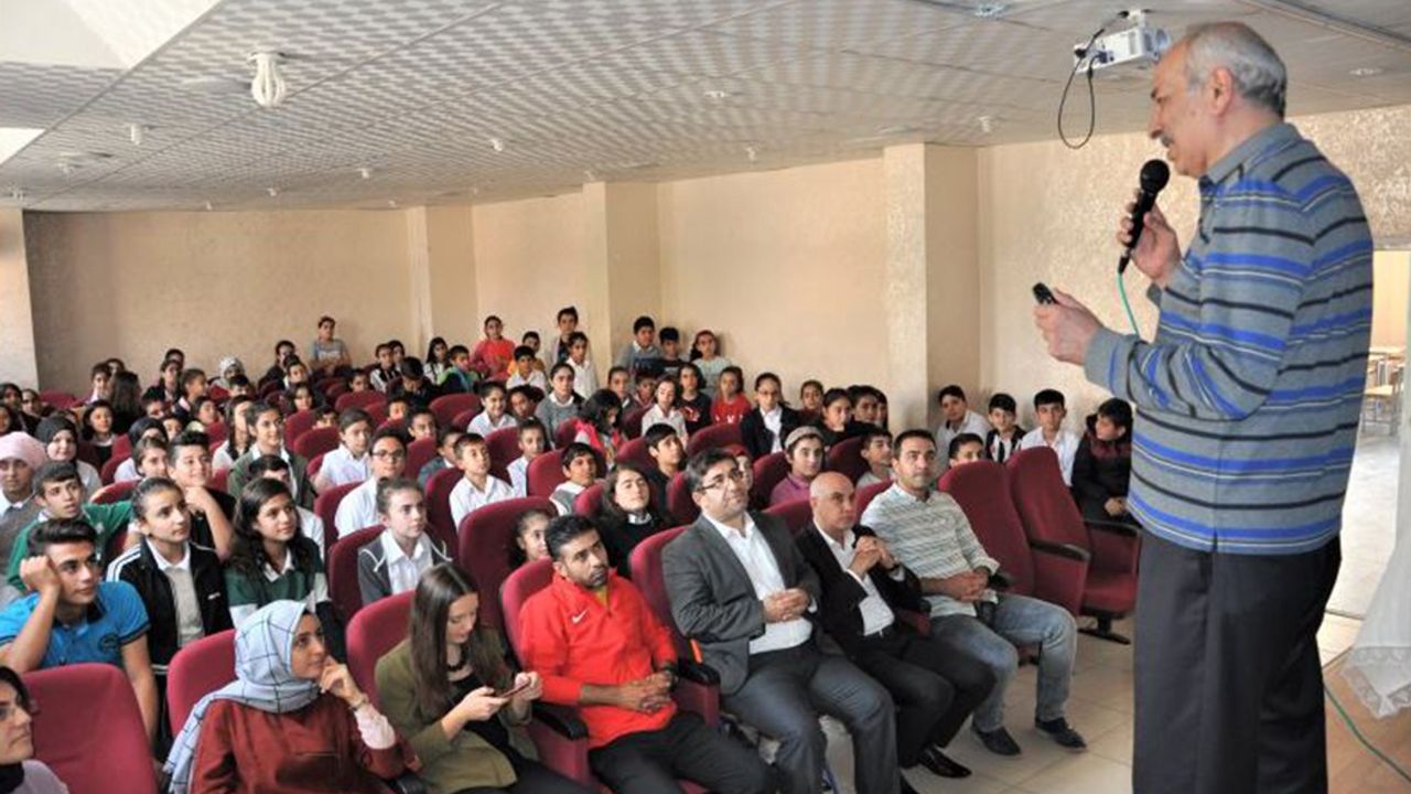 Okulun konferans salonunda gerçekleşen programa öğretmenler ve öğrenciler