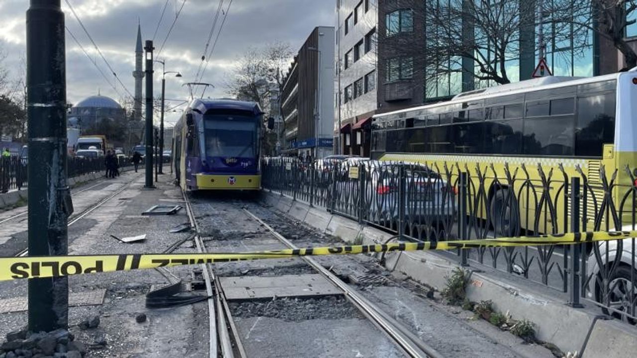 Raydan çıkan tramvay olay yerinde bekletilirken, ekipler kazayla ilgili inceleme başlattı.
