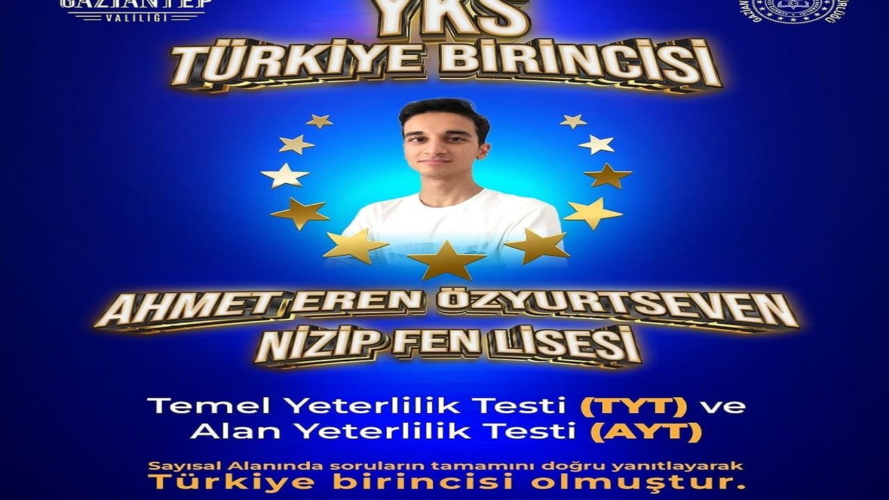 Gaziantep İl Milli Eğitim Müdürlüğünden yapılan açıklamada, "Ahmet Eren Özyurtseven, YKS’nin tüm aşamalarında gösterdiği yüzde 100 başarıyla yalnızca bireysel bir zafere değil, aynı zamanda Gaziantep’in eğitimdeki gücüne de imza atmıştır. Bu üstün başarı, öğrencimizin azmi ve disiplini kadar ailesinin desteği, öğretmenlerinin rehberliği ve okul yönetiminin özverili çalışmaları sayesinde mümkün olmuştur. Gaziantep İl Millî Eğitim Müdürlüğü olarak gösterdiği üstün başarıyla Türkiye’nin zirvesine çıkan, hem kendinin hem de ilimizin adını gururla duyuran öğrencimiz Ahmet Eren Özyurtseven’i gönülden tebrik ediyor; Bu anlamlı başarıda emeği geçen tüm öğretmenlerimize, okul yönetimine ve kıymetli ailesine en içten teşekkürlerimizi sunuyoruz." denildi.