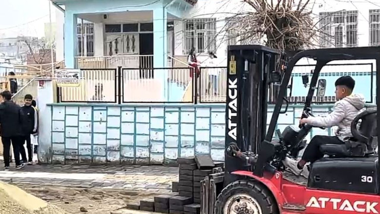 Elektrik kablolarının yer altına alınması sebebiyle bozulan sokakların yenilenme çalışmalarının devam ettiği Yeni Mahalle'de iş makinesini kullanan bir çocuğun görüntüleri tepki çekti.