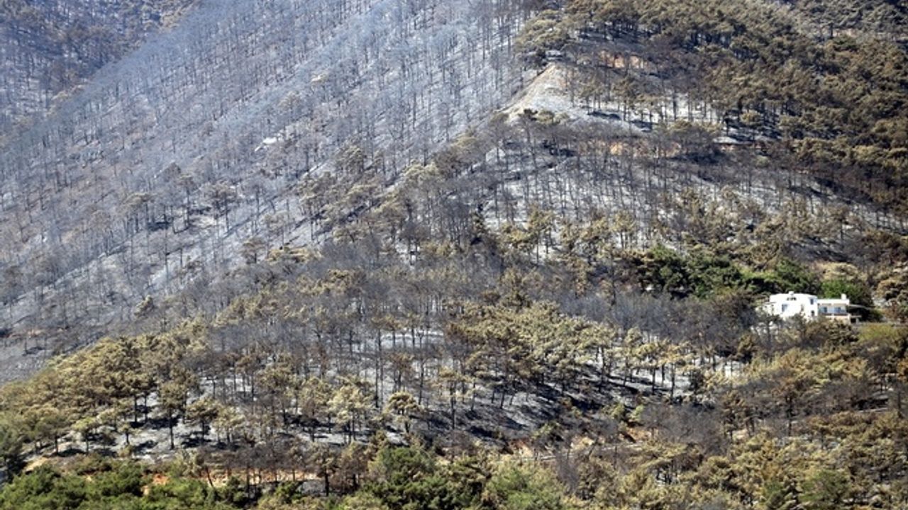Orman yangınında zarar gören alanlar ile devam eden soğutma çalışmaları görüntülendi.