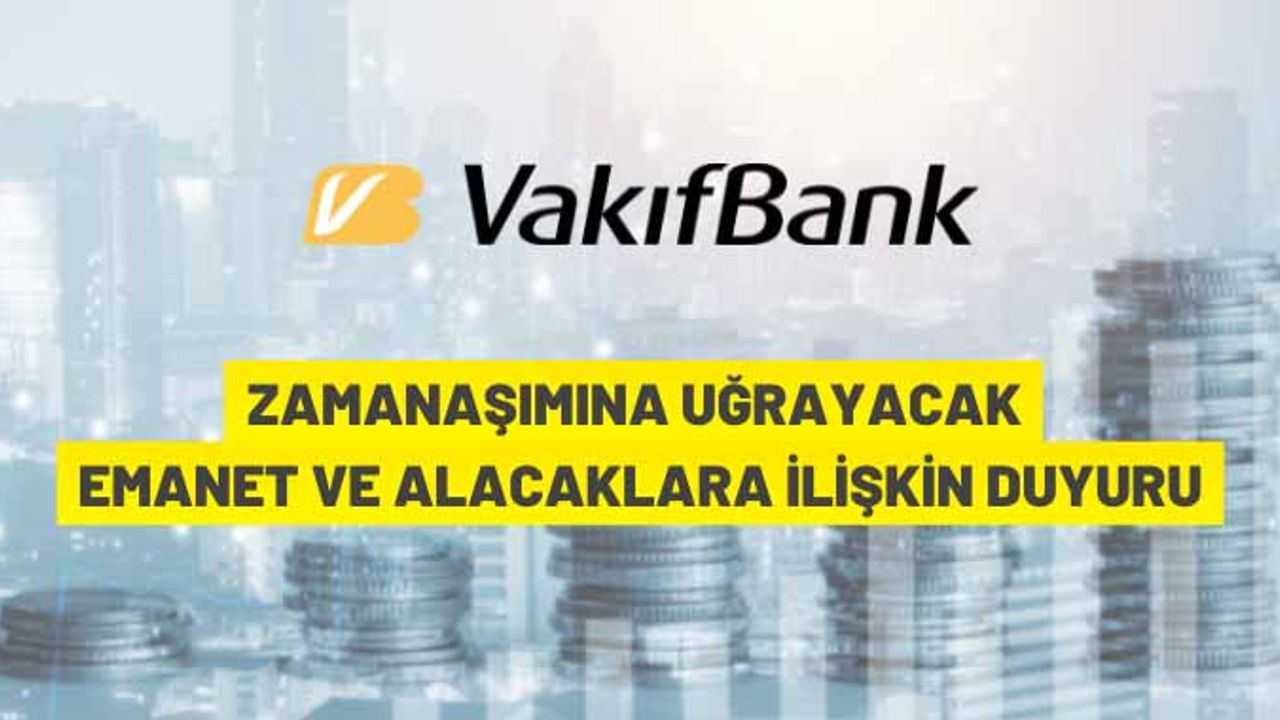 Basın İlan Kurumu ilan portalı ilan.gov.tr'de yer alan ilana göre; Türkiye Vakıflar Bankası T.A.O., müşterine ait 1 Ocak 2023 ve 31 Aralık 2023 tarihleri arasında zamanaşımına uğrayacak yatırım hizmetleri ve faaliyetlerden kaynaklanan her türlü emanet ve alacaklara ilişkin duyuru yayınladı. Duyuruda, "30.12.2012 tarih ve 6362 sayılı Sermaye Piyasası Kanunu'nun 83. maddesi dördüncü fıkrası hükmü ve 27.02.2015 tarih ve 29280 sayılı Resmi Gazete'de yayımlanan Yatırımcı Tazmin Merkezi'ne ilişkin Yönetmeliğin 25. maddesi gereğince; Bankamız nezdinde 01.01.2023-31.12.2023 tarihleri arasında zaman aşımına uğrayacak, yatırım hizmetleri ve faaliyetlerinden kaynaklanan her türlü emanet ve alacaklar internet sayfamızda (www.vakifbank.com.tr) ilan edilmiş olup, 31.12.2023 tarihine kadar müşterilerimizin sorgulamalarına açık kalacaktır" açıklamasına yer verildi.